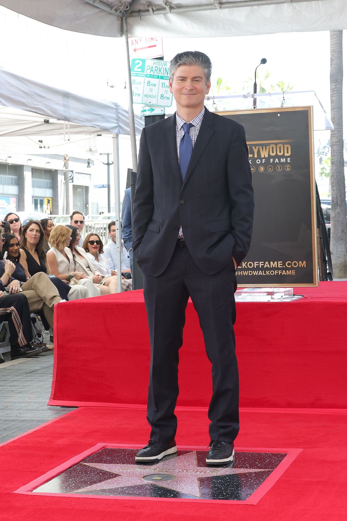 Michael Schur poses with his Hollywood Walk of Fame Star during his Hollywood Walk of Fame Star Ceremony on the Hollywood Walk of Fame on May 21, 2025 in Hollywood, California