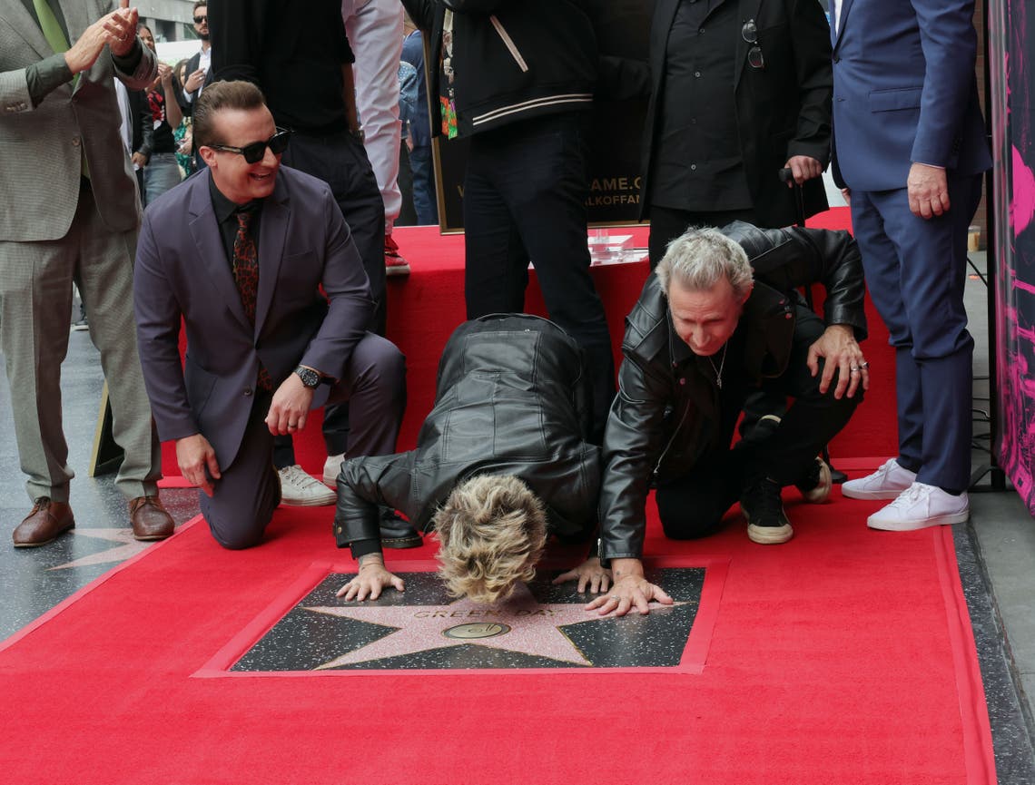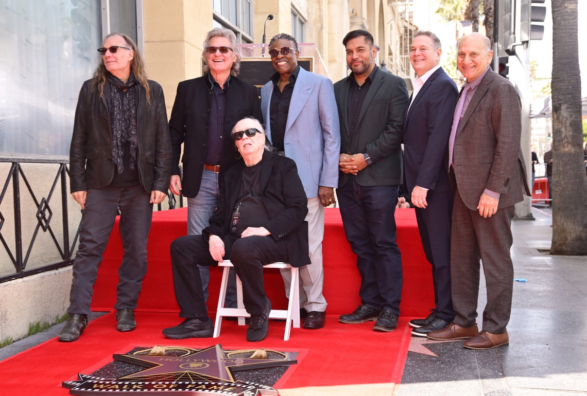 Rob Cavallo, Ryan Reynolds, Tré Cool, Billie Joe Armstrong, Matt Pinfield and Mike Dirnt attend the Green Day Hollywood Walk of Fame Star Ceremony on May 1, 2025 in Hollywood, California