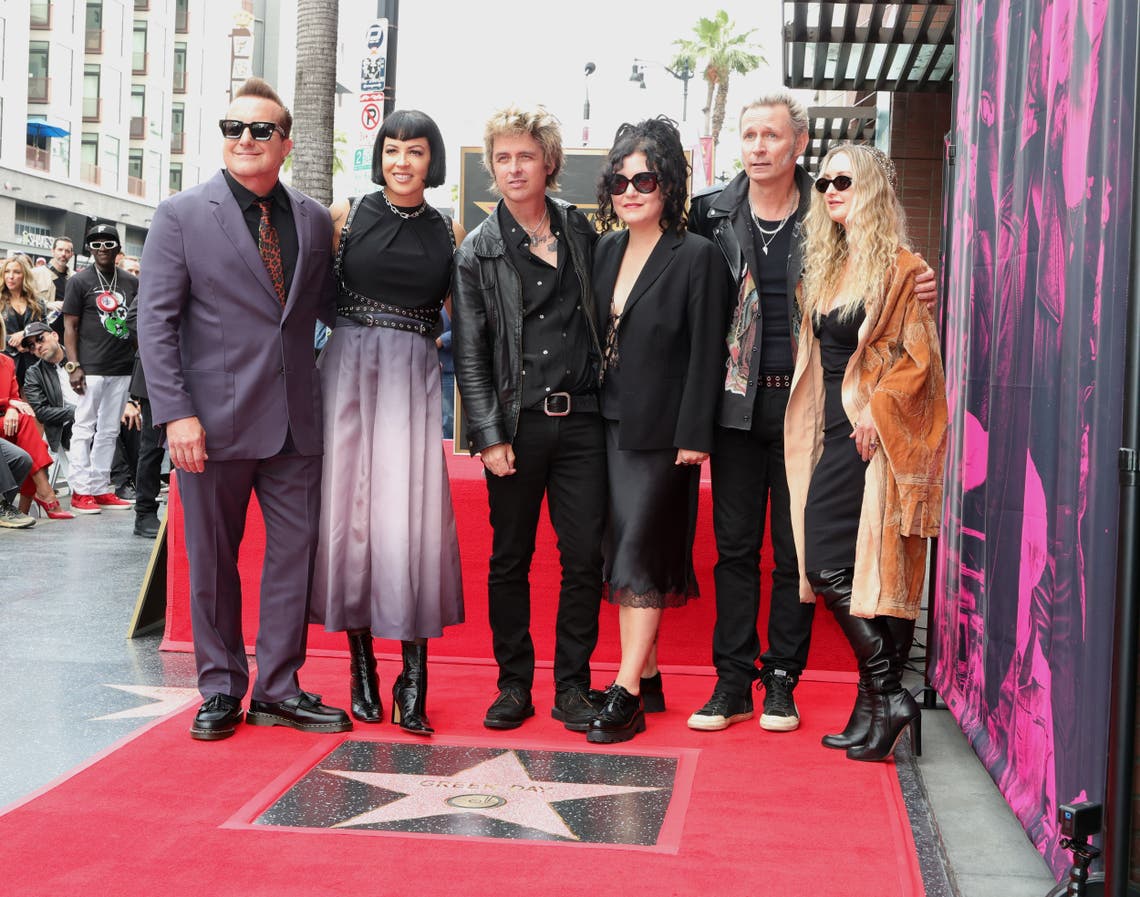 Tré Cool, Sara Rose Lipert, Billie Joe Armstrong, Adrienne Armstrong, Mike Dirnt and Brittney Cade attend the Green Day Hollywood Walk of Fame Star Ceremony on May 1, 2025 in Hollywood, California