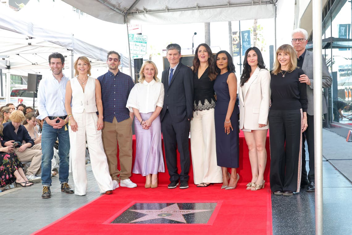 Max Greenfield, Mary Elizabeth Ellis, Andy Samberg, Amy Poehler, Michael Schur, D’Arcy Carden, Mindy Kaling, Lilah Richcreek Estrada, Mary Steenburgen and Ted Danson attend Michael Schur’s Star Ceremony on the Hollywood Walk of Fame on May 21, 2025 in Hollywood, California