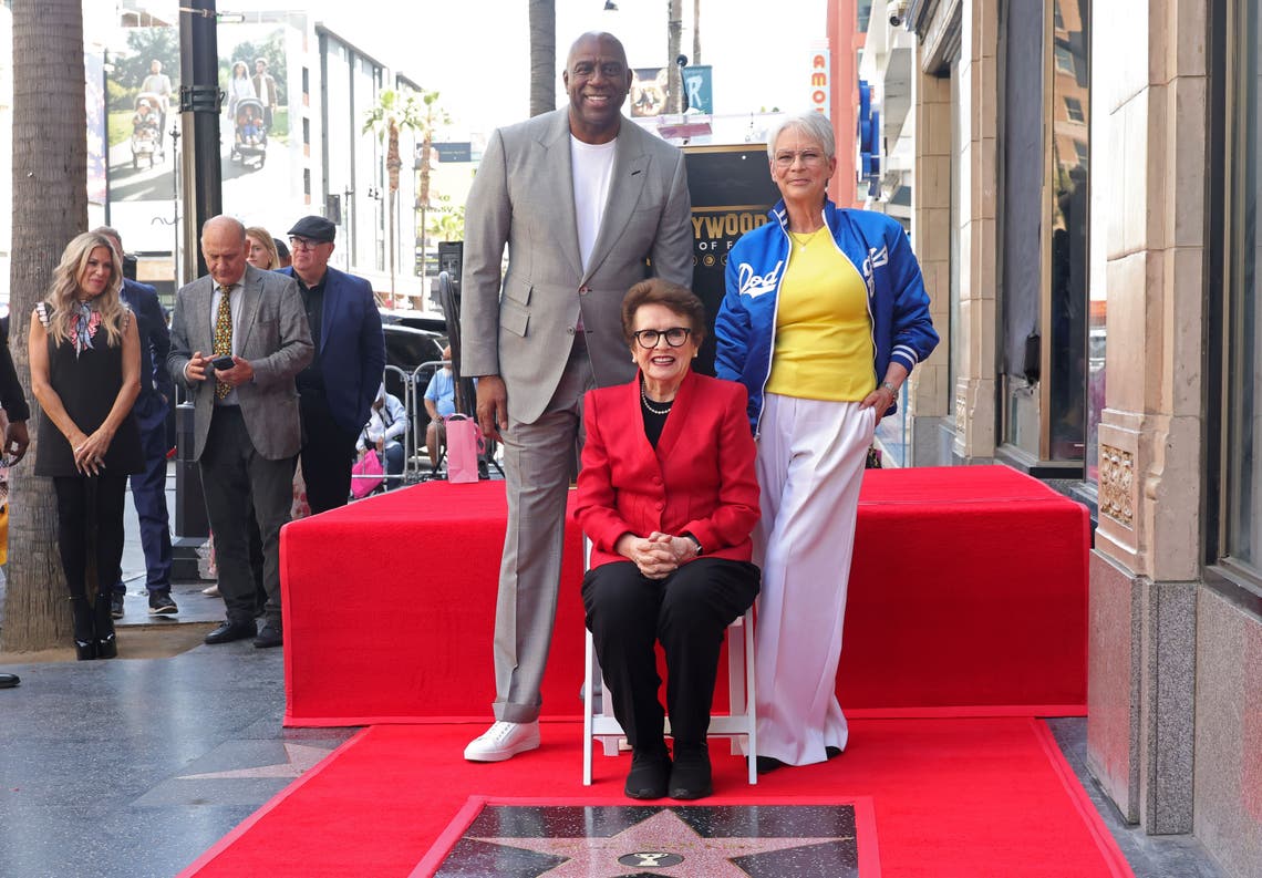 Magic Johnson, Billie Jean King and Jamie Lee Curtis attend the Hollywood Walk of Fame Star Ceremony Honoring American Tennis Player Billie Jean King on April 7, 2025 in Hollywood, California