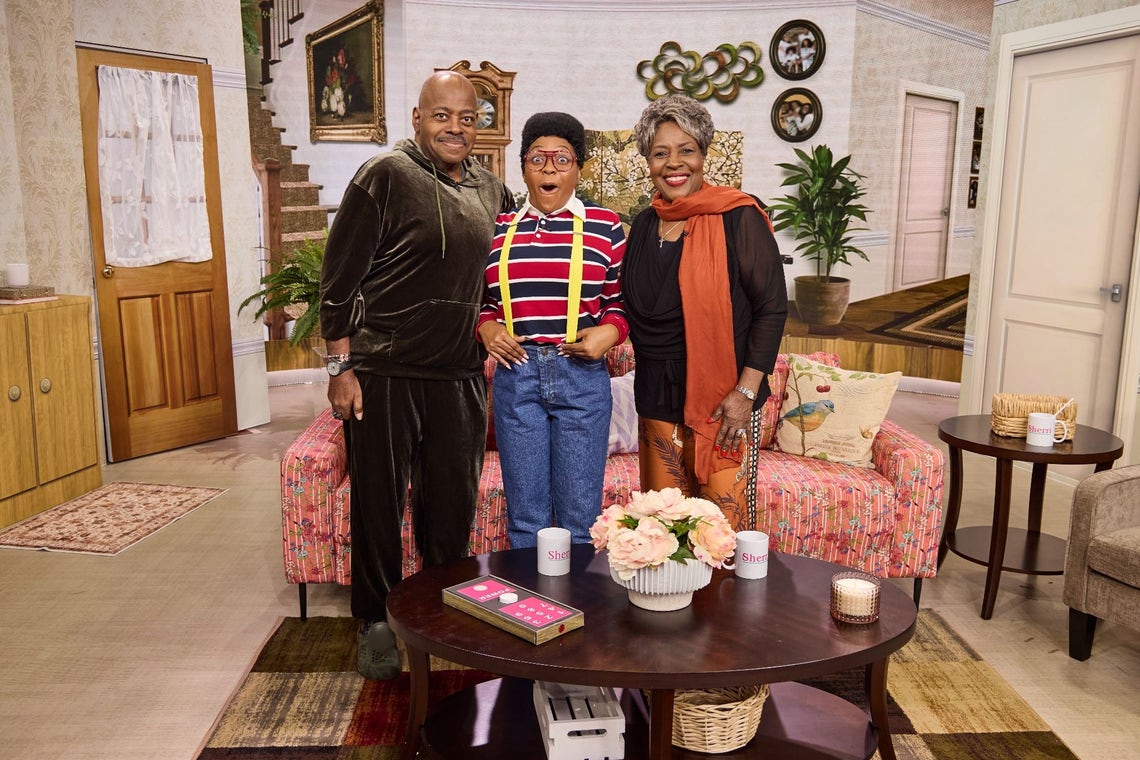 Sherri Shepherd dressed up as Steve Urkel from Family Matters while interviewing Reginald VelJohnson and Jo Marie Payton, who played the Winslows.