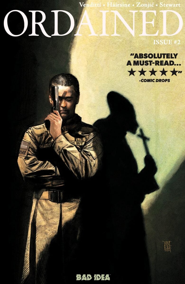 Ordained is the new offering from the folks over at Bad Idea, written by Robert Venditti and art by Trevor Hairsine and Dave Stewart. The story of a priest being called to do the last rites on a dying man, finding out more than he should, and ending up at the wrong place at the wrong time. Venditti caught up with The Beat to talk about Priest Roy, his dark past, and we get a little sneak peek at the preparation Colin Farrell is doing after the recent announcement of an upcoming film adaptation of Ordained.