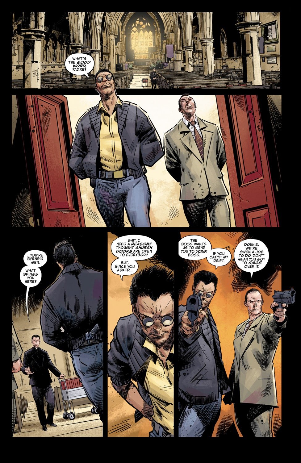Javier Perez: Ordained feels very deliberate in what it tells you and shows you, a real noir. It really likes to dwell on those moments of conversation, and that helps highlight the seriousness of what is at hand. What is the approach that you took on this story?