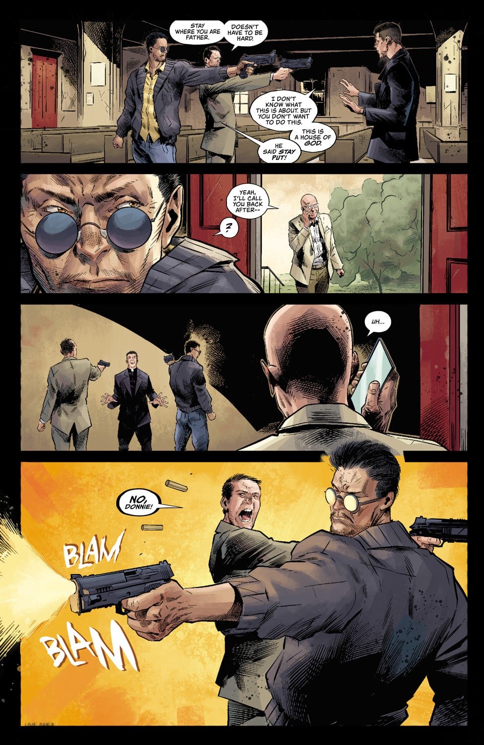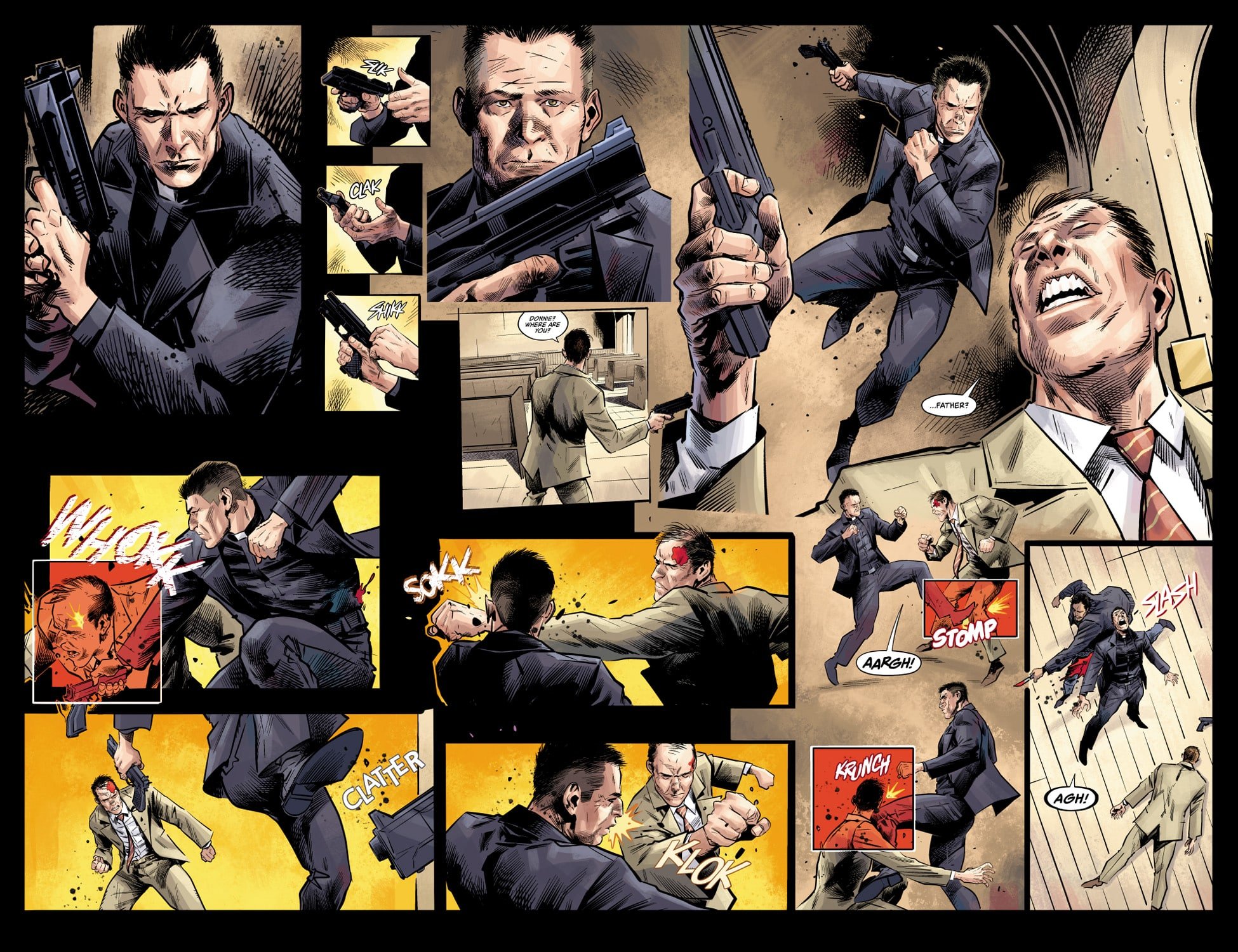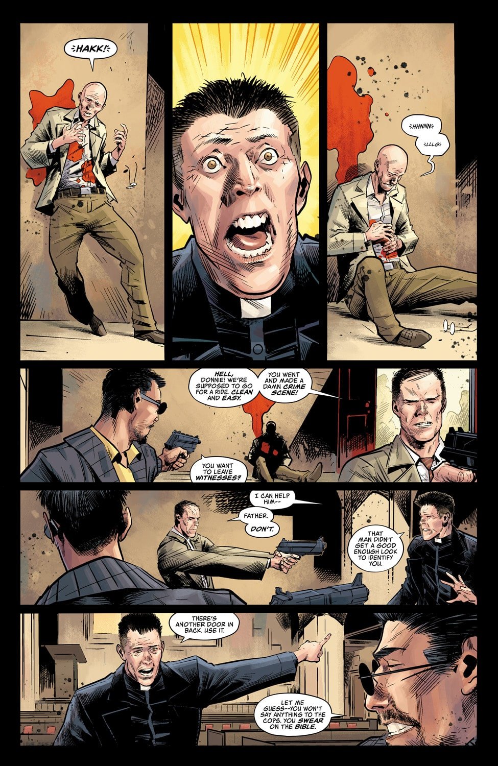 Venditti: Trevor is amazing. I’d only worked with him one time before Ordained, on a couple of issues of X-O Manowar way back in the first year of that run. I’ve been trying to work with him again ever since. He’s the rare type of talent whose action sequences are kinetic and explosive, while his quieter moments really make you feel the emotions and the acting. He’s also heavy on the inks, and all that black is the perfect tone for a crime story. Even more so for a story where the main character wears a priest’s black clothes and white collar the entire time.