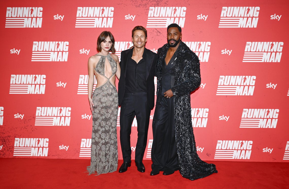 Emilia Jones, Glen Powell and Colman Domingo attend “The Running Man” UK Premiere at Odeon Luxe Leicester Square on November 5, 2025 in London, England