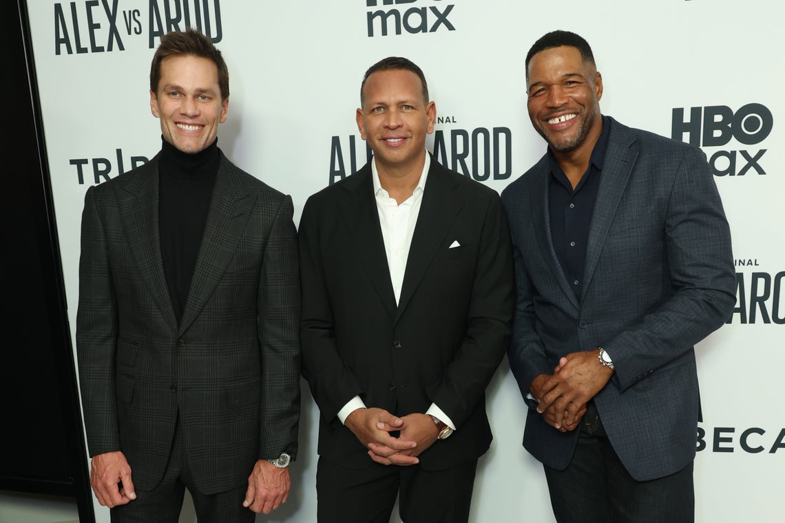 Tom Brady, Alex Rodriguez and Michael Strahan attend “Alex Vs ARod” New York Premiere at DGA Theater on November 3, 2025 in New York City