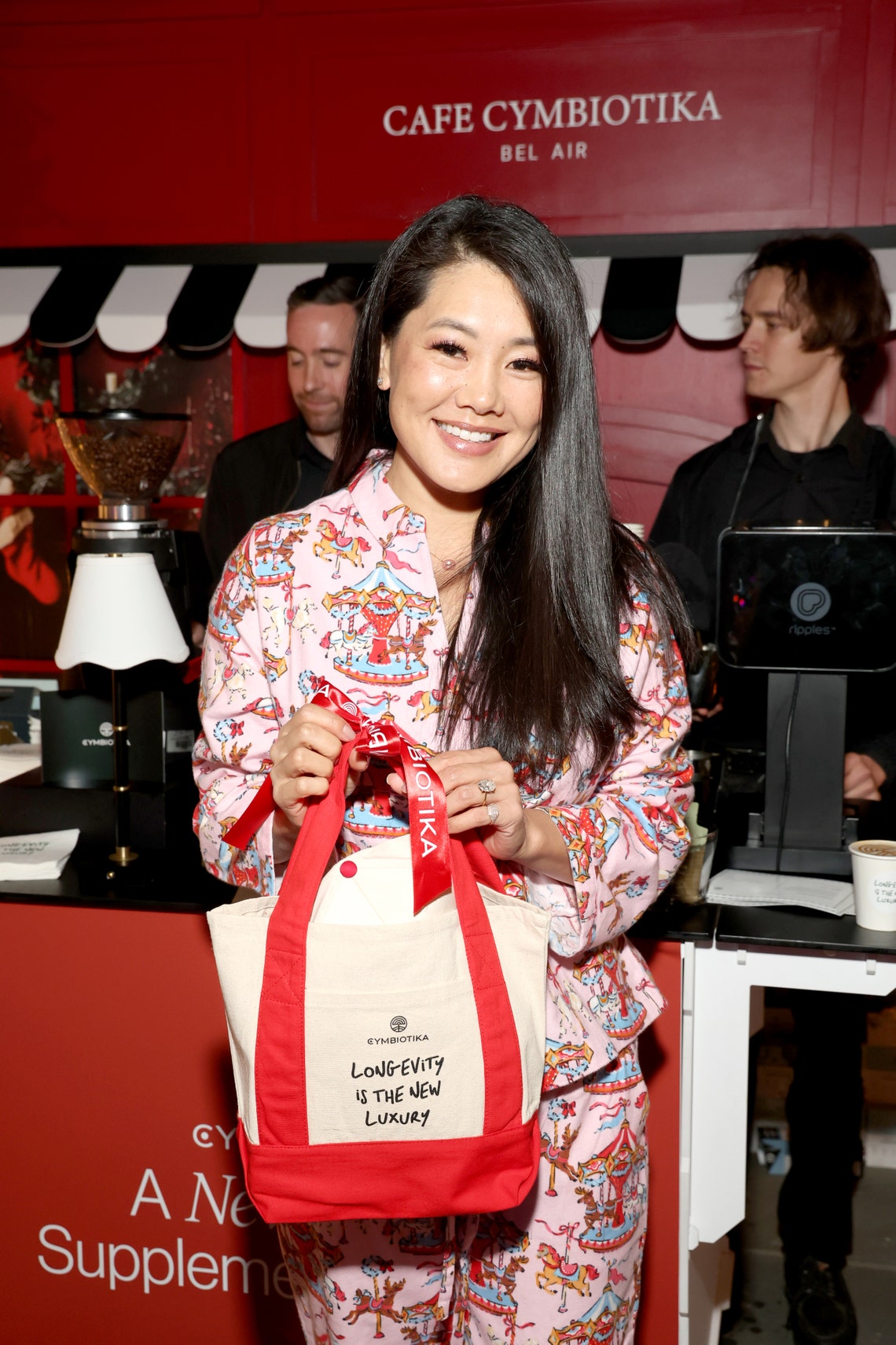 Real Housewives star Crystal Kung Minkoff – in Printfresh x Kathy Hilton Pajamas – hung out in the Cymbiotika Cafe and took home goodies from Anna Zuckerman during Kathy Hilton’s QVC-hosted pajama party.