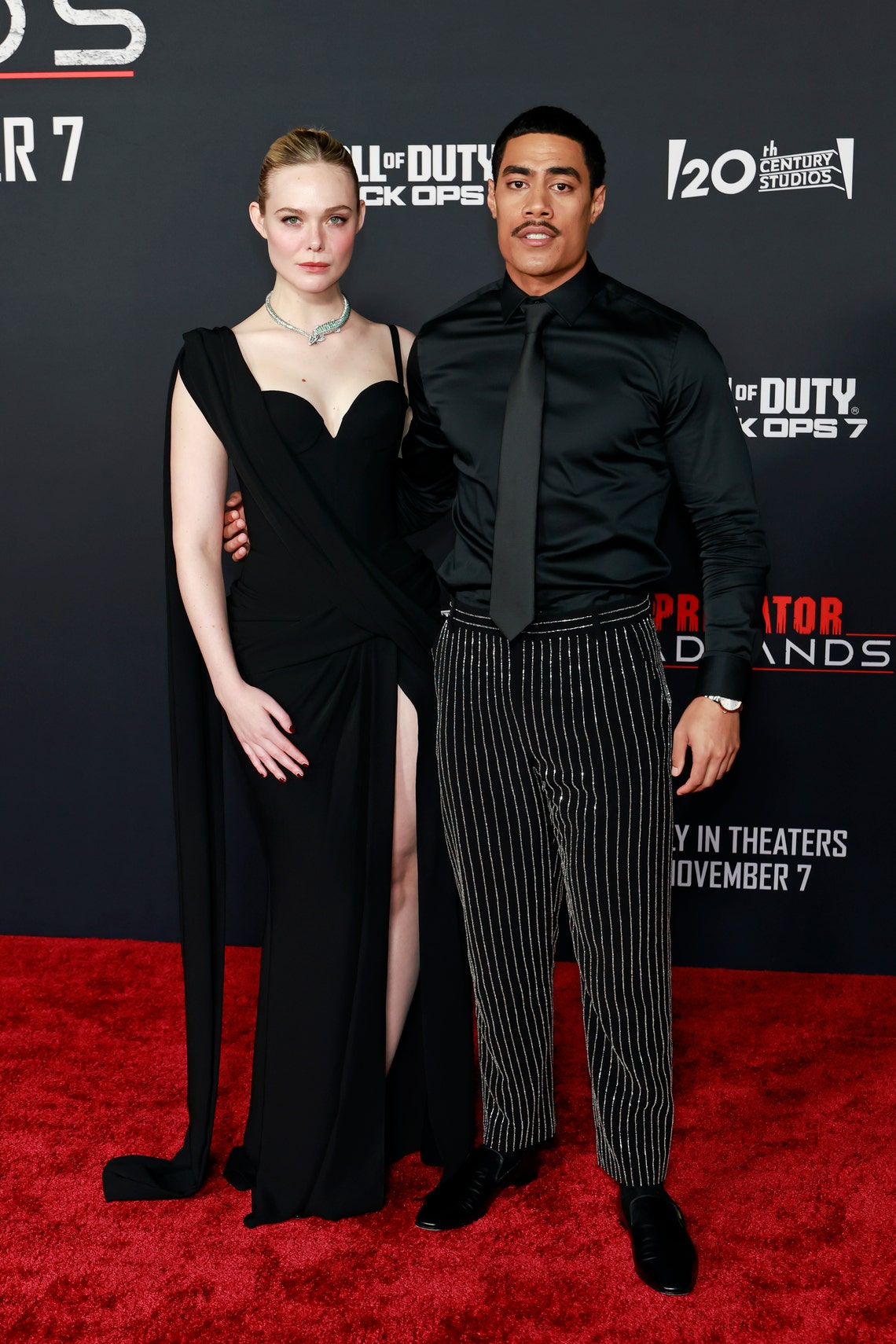 Elle Fanning and Dimitrius Schuster-Koloamatangi attend the World Premiere of 20th Century Studios “Predator: Badlands” at TCL Chinese Theatre on November 3, 2025 in Hollywood, California